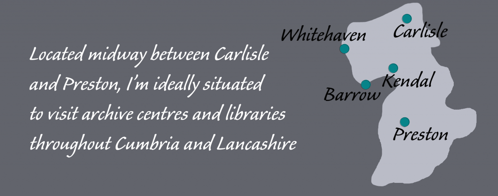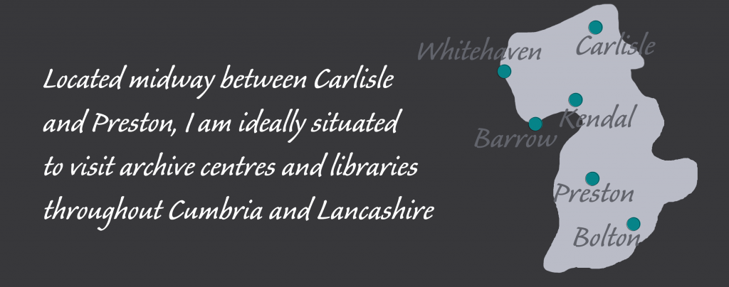 I will help you find family across England as far back as 1837 when civil registration began. Before this I can discover Westmorland, Cumberland and Lancashire ancestors by searching parish registers, bishop’s transcripts, probate records, and the many other documents and manuscripts that are held in Lancashire Archives, Cumbria Archives, and elsewhere.
